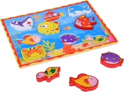 Puzzle-ul din lemn Marea JOKOMISIADA îmbină învățarea cu distracția. Piesele solide, masive, se prind ușor de către copii și se potrivesc perfect în decupajele de pe placa din lemn. Ilustrațiile colorate ale viețuitoarelor marine stimulează imaginația și curiozitatea.