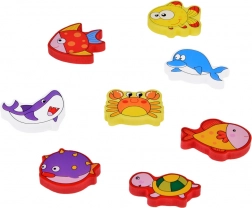 Copiii învață cu ușurință să recunoască forme și denumiri de animale, precum rechin, pește, crab sau țestoasă. Susține vocabularul și percepția vizuală.