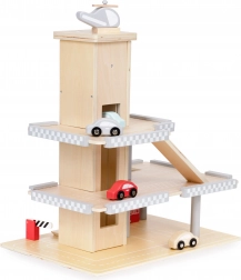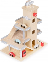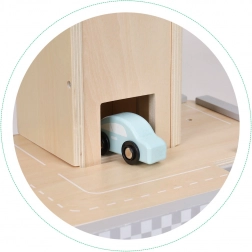 Acest garaj din lemn cu design modern va încânta orice copil care iubește mașinile și jocul creativ. Datorită celor trei niveluri, rampelor line și liftului care oprește la fiecare etaj, oferă ore întregi de distracție și dezvoltă motricitatea fină și imaginația.
