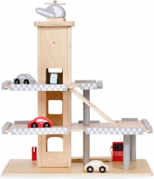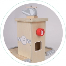Sunt incluse un elicopter cu platformă de aterizare pe acoperiș, 4 mașinuțe, stație de alimentare și barieră mobilă pentru un joc realist. Construcția de calitate din lemn, fără muchii ascuțite, asigură o joacă 100% sigură.