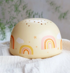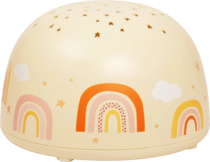 Această lampă de noapte galben vanilie, cu motiv de curcubeu, proiectează stele pe pereții și tavanul camerei copilului și îi ajută pe cei mici să adoarmă liniștit. Datorită dimensiunilor compacte este ușor de transportat, iar funcționarea fără fir pe baterii o face un accesoriu ideal pentru orice cameră de copii.