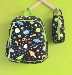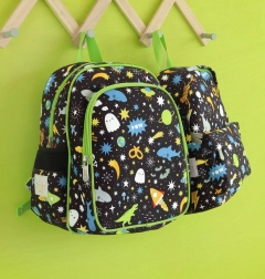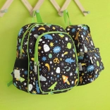 Rucsac stilat pentru copii, cu motiv spațial, ideal pentru grădiniță și excursii. Oferă un compartiment principal încăpător, un buzunar frontal izolat pentru gustare și două buzunare laterale pentru sticlă. Pentru confort și siguranță are bretele de umăr căptușite, curea de piept anti-alunecare și panou dorsal căptușit și respirabil.
