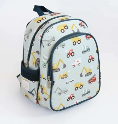 Rucsac pentru copii stilat cu motiv de vehicule, cu compartiment principal spațios, buzunar frontal izolat pentru gustare și buzunare laterale pentru sticlă. Datorită bretelelor de umăr căptușite, curelei de piept și panoului dorsal respirabil, este confortabil de purtat la grădiniță, în excursii și călătorii.