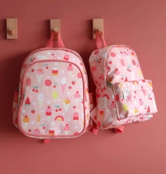 Un rucsac adorabil și practic pentru copii, cu motiv de înghețată, ideal pentru grădiniță și excursii. Oferă o compartimentare principală spațioasă, un buzunar frontal izolat pentru gustare, două buzunare laterale pentru sticlă și bretele căptușite cu chingă de piept pentru purtare confortabilă și sigură.
