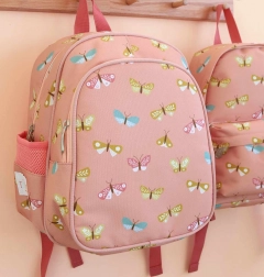 Un rucsăcel roz stilat cu motiv de fluturi de la A Little Lovely Company, ideal pentru grădiniță și excursii. Oferă o compartimentare principală încăpătoare, buzunar frontal izolat pentru gustare, buzunare laterale pentru sticlă și bretele căptușite, reglabile, cu curea de piept pentru purtare sigură și confortabilă.