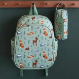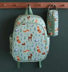 Rucsac spațios, verde mentă, cu motiv de animale ale pădurii, ideal pentru grădiniță și excursii. Oferă un compartiment principal mare, buzunar frontal izolat pentru gustare, buzunare laterale pentru sticlă și bretele căptușite cu curea de piept pentru purtare confortabilă și sigură.
