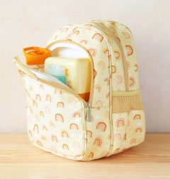 Rucsac pentru copii stilat, cu motiv de curcubeu, ideal pentru grădiniță și excursii. Oferă o compartimentare principală spațioasă, o buzunar frontal izolat pentru gustare și două buzunare laterale pentru sticlă. Pentru un transport confortabil are bretele căptușite, curea de piept anti-alunecare și panou dorsal căptușit și respirabil.