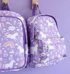 Rucsac adorabil pentru cei mici de la 2 ani, cu compartiment principal spațios, buzunar frontal cu fermoar și bretele căptușite pentru purtare confortabilă. Poliester ușor și rezistent, cu motiv vesel cu unicorni și curcubeu, și curea de piept pentru fixare sigură pe umeri.