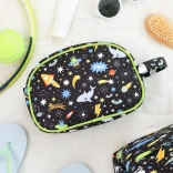 Trusă de toaletă pentru copii stilată, cu motiv de rachete, planete și stele, ideală pentru excursii, tabere și vacanțe. Oferă un compartiment spațios pentru toate produsele de igienă și are un mâner practic pentru transport și agățare ușoară. Material textil rezistent, cu fermoar sigur, pentru ca totul să rămână ordonat la locul său.