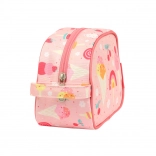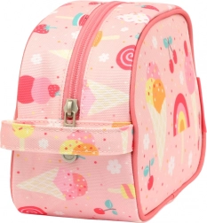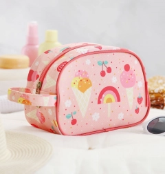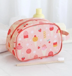 Trusă de toaletă roz drăgălașă, cu model de înghețată, ideală pentru călătorii, tabere și utilizare zilnică. Oferă o compartimentare principală spațioasă, un mâner practic pentru transport ușor și un material ușor, ușor de curățat.
