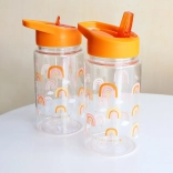 Sticlă transparentă pentru copii, cu motiv vesel de curcubeu și volum de 450 ml, ideală pentru grădiniță și excursii. Datorită materialului Tritan este ușoară și rezistentă, iar capacul cu pai asigură băutul fără scurgeri și confortabil. Se potrivește perfect cu setul în același design – sticlă, rucsac și cutie pentru gustare.