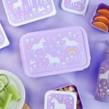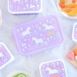 Cutia de gustare adorabilă de la A Little Lovely Company îi încântă pe copii cu un design jucăuș cu unicorni și curcubeu, iar pe părinți cu o execuție bine gândită. Datorită capacului care etanșează ferm, conținutul rămâne proaspăt și în siguranță. Tava detașabilă cu două compartimente permite organizarea clară a fructelor, legumelor, produselor de panificație sau dulciurilor.