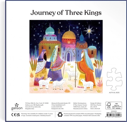 Lăsați-vă purtați sub steaua strălucitoare până la Betleem și reconstruiți povestea Celor Trei Magi. Acest puzzle de Crăciun, colorat și bogat în detalii, este ideal atât pentru momente de tihnă, cât și pentru distracția în familie. După asamblare, formează o imagine pătrată de 50,8 × 50,8 cm, care se remarcă și ca decorațiune.