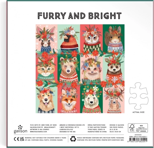 Un puzzle adorabil cu tematică de iarnă, cu prieteni blănoși în ținute de sărbătoare, aduce în casă atmosfera autentică. Are 500 de piese, este fabricat din hârtie reciclată FSC și imprimat cu cerneluri netoxice. În pachet este inclusă o imagine de referință. O alegere grozavă pentru copii și adulți și un cadou de Crăciun ideal.