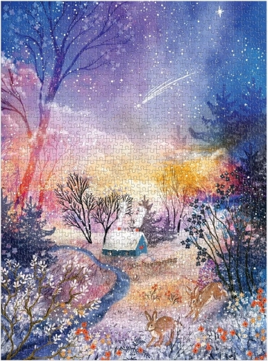 Ilustrația onirică a lui Laivi Põder aduce farmecul unei nopți de iarnă cu stele strălucitoare, căsuță și cerbi, încântând ochiul și mintea.