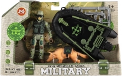 Soldatul detaliat, cu cască, vestă și pușcă, permite poziții dinamice și acțiune realistă la fiecare joacă.