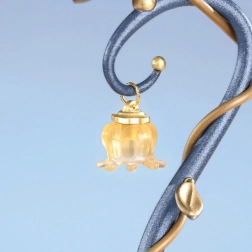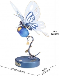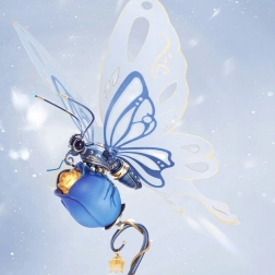Acest fluture mecanic, realizat cu mare atenție la detalii, stă pe bobocul unui trandafir, care este conectat la o bază stabilă printr-o tijă metalică decorativă. Aripile din PVC subțire (0,15 mm) sunt decorate cu modele elegante în culoarea șampaniei, iar partea din spate a corpului este evidențiată de un „giuvaer” sclipitor. După pornire, fluturele prinde viață – bate din aripi, trandafirul luminează ușor auriu, iar antenele clipesc.