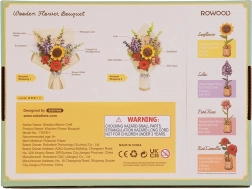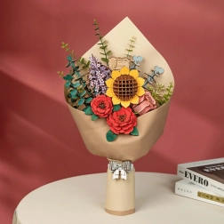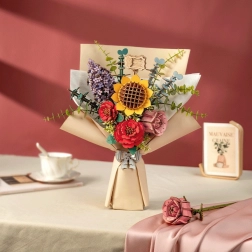 Descoperiți magia buchetului de flori care nu-și va pierde niciodată frumusețea. Puzzle-ul din lemn 3D conține floarea-soarelui, liliachiu, camelia roșie, trandafir roz și eucalipt. Fiecare floare are tulpina cu înălțime reglabilă, permițând aranjamente variate.