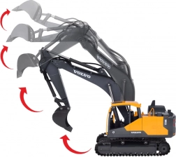 Excavatorul de construcții Volvo vine echipat cu accesorii interschimbabile - cupă, ciocan și prindere, care permit simularea diferitelor sarcini de construcții. Împreună cu rotații de 360° și iluminare LED intensă, oferă posibilități nelimitate de distracție și educație.