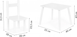 Masă: 55 × 40 × 43 cm. Scaun: înălțime 51,5 cm, lățime 28 cm, înălțimea șezutului 23,5 cm. Ergonomie pentru confort și o postură corectă a copiilor de la 3 ani.