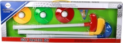 Acest set colorat de mini-golf oferă tot ce au nevoie copiii pentru joc: 3 crose rezistente (aprox. 52 cm), 3 guri de golf în culorile verde, roșu și galben, 3 stegulețe de start și 3 mingi albe (diametru aprox. 3,5 cm). Fiecare crosă are o formă diferită a capului, adăugând strategie și varietate jocului.