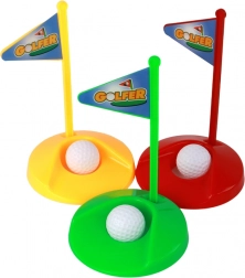 Trei guri de golf cu stegulețe de start oferă ținte clare și competitivitate distractivă la fiecare joc.