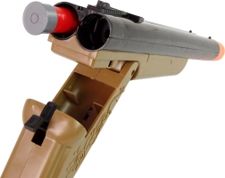 Pușca arată exact ca cea pe care o au cowboyii în filmele western. În mijlocul armei se află o pârghie care o pliază la jumătate. Acest lucru permite introducerea cartușelor mari. Printr-o mișcare lină în sus o închizi și este gata de „tragere”. În interior sunt două orificii pentru cartușe, poți „trage” două focuri la rând. Nu vor „trage” simultan, cele două trăgace îți permit să „tragi” unul după altul. Pușca emite doar efecte sonore, din țeavă nu iese nimic, ceea ce garantează siguranța copilului tău.