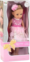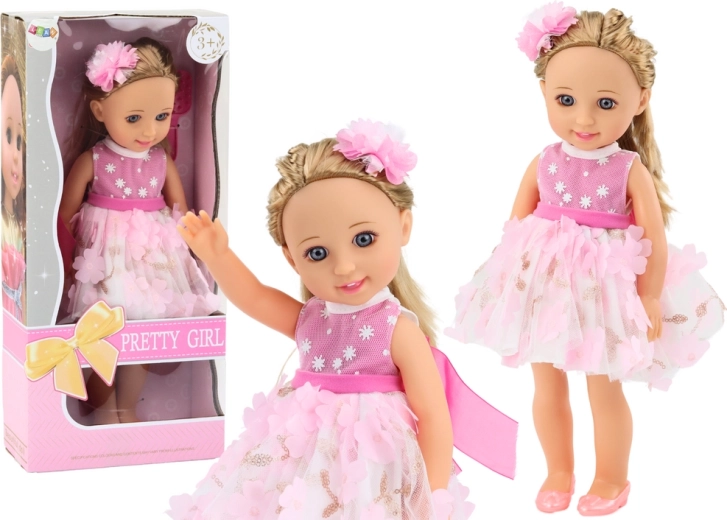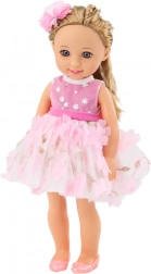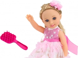 Păpușa are păr blond lung, care poate fi coafat în diverse moduri, și este livrată cu o perie pentru pieptănat și aranjat părul. Părul este decorat cu o agrafă drăgălașă, care îi oferă păpușii un plus de farmec. Este îmbrăcată într-o rochie frumoasă roz-alb, decorată cu flori roz și accesorii aurii. Rochia este elegantă și stilată, ideală pentru orice ocazie. Păpușa poartă pantofi roz care se potrivesc perfect cu rochia. Are un machiaj fin, care îi subliniază look-ul elegant, iar ochii și buzele sunt atent pictate, oferindu-i expresivitate și farmec.