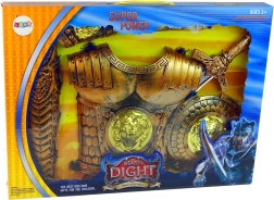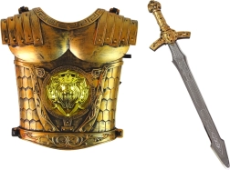 Prezentăm costumul de cavaler pentru copii, care va transporta fiecare mic erou în lumea magică a basmelor. Armura aurie cu accesorii precum apărătoare, scut și coroană oferă copilului senzația de adevărat războinic medieval. Toate părțile sunt realizate din plastic de calitate și sigur care asigură un joc de lungă durată și sigur.