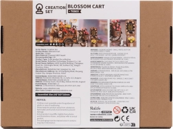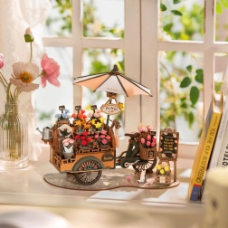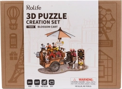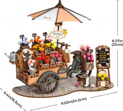 Descoperiți frumusețea vânzării de flori pe stradă cu puzzle-ul 3D din lemn Cărucior de flori Rolife. Acest model aduce farmecul piețelor vechi în casa dumneavoastră. Căruciorul este echipat cu roți rustice, umbrelă și o cană pentru udare. Modelul finit va deveni o frumoasă decorațiune care va înviora orice interior.