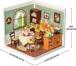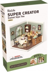 Miniatura Ceainăria Dulce este ideală dacă doriți o pauză stilată în mediul cu atmosferă de epocă, unde nu lipsesc masa rotundă cu față de masă din dantelă, căni și farfurii pline de dulciuri. Montare ușoară fără utilizarea lipiciului este susținută de piesele precis tăiate care se asamblează simplu.