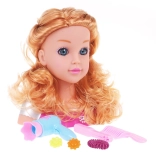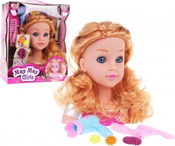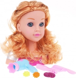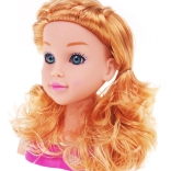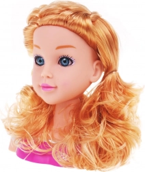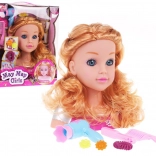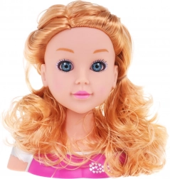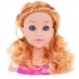 Părul lung și ondulat blond și expresia realistă a feței oferă o experiență autentică de coafură și stimulează creativitatea copiilor.