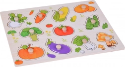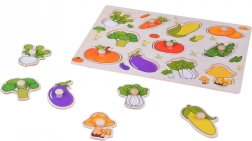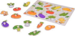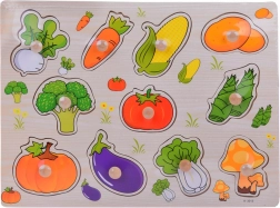 Puzzle-ul conține 11 piese colorate reprezentând diferite tipuri de legume precum sfecla, morcovul, porumbul și altele.