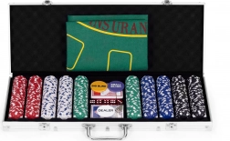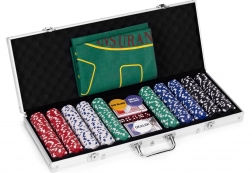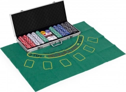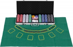Include 500 de jetoane, 2 pachete de cărți, zaruri și preș de joc. Toate într-o servietă practică cu încuietoare.
