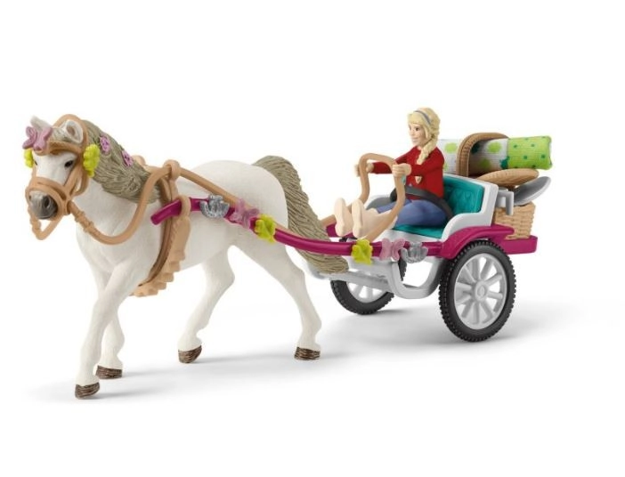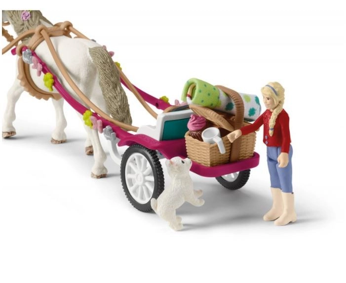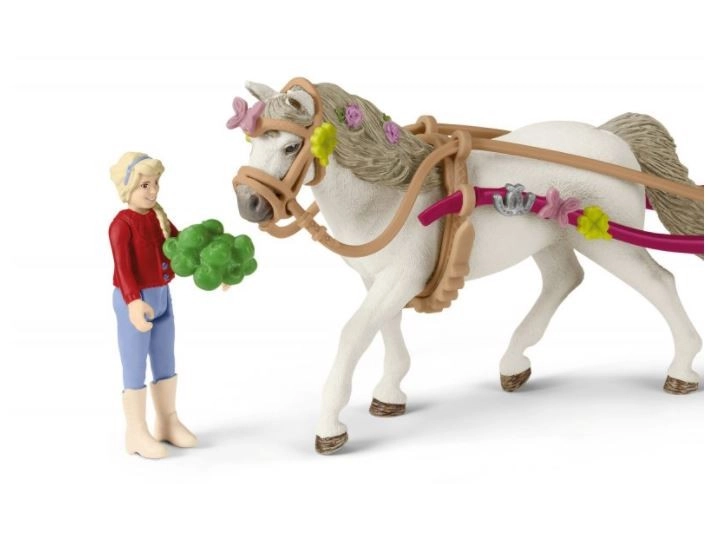 Clara a pornit la marea paradă de cai cu o trăsură împodobită cu detalii în formă de căluți și modele multicolore. Calul ei preferat Connemara are o căpăstru decorat cu alte decorațiuni. Acest set fermecător include și o pătură de picnic și un coș cu delicii, pe care Clara le va folosi la parada sa preferată. La parada de cai, se poate bucura de momente de relaxare și poate împărți bucuria cu ceilalți călăreți.