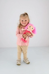 Păpușa din pânză Mazlinka este concepută pentru a le oferi copiilor un sentiment de siguranță și bucurie. Materialul textil fin și aspectul drăgălaș, cu păr roz și rochiță, susțin motricitatea fină și imaginația în joaca de zi cu zi.