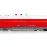Trenul roșu-alb cu detalii atent lucrate este ideal pentru joacă creativă și ca un cadou – ambalajul cu fereastră transparentă va încânta orice mic fan al căilor ferate. La pornire se aprinde farul frontal și se aud sunetele unui tren în mers, subliniind experiența realistă.
