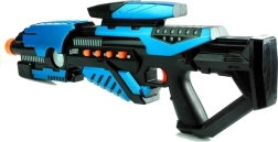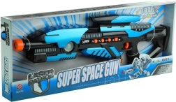 Cu această pistolă cosmică fiecare tânăr războinic va fi pregătit pentru aventuri incredibile. Designul negru și turcoaz combinat cu detalii portocalii garantează un aspect modern. Pistolul este echipat cu mai multe butoane - primul pentru activarea sunetului, altul pentru schimbarea culorii luminilor LED, oferind selecție din cinci culori: albastru, verde, roz, galben și roșu. Alte butoane schimbă modul armei și sunetele de reîncărcare.