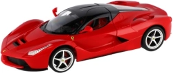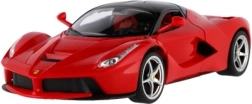 Replica detaliată FERRARI LaFerrari în roșu cu accente negre impresionează prin execuția precisă și ușile funcționale, care subliniază aspectul realist al modelului.