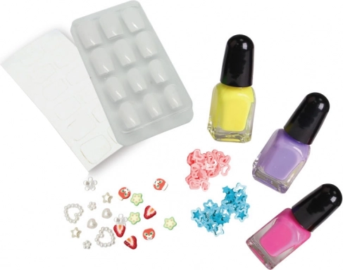 - 3 lacuri colorate, 12 unghii false, 12 autocolante, 2 tipuri de sclipici, 19 piese de decorațiuni 3D, instrucțiuni