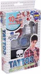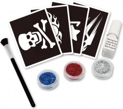 - pensulă; 4 șabloane (reutilizabile); adeziv pentru tatuaje; sclipici în 3 culori; instrucțiuni