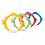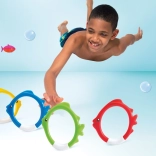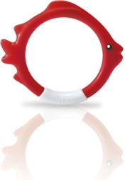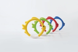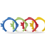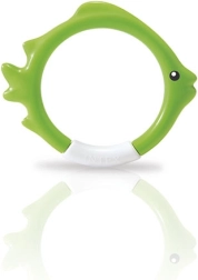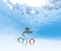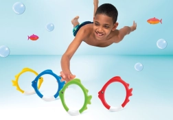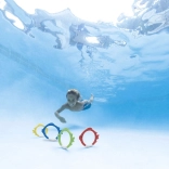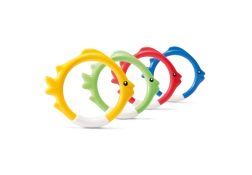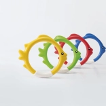 Set distractiv cu patru inele de scufundare în formă de peștișori pentru copii de la 6 ani. Inelele în culorile albastru, roșu, verde și galben se stabilizează vertical pe fundul apei după aruncare, ceea ce motivează la antrenarea scufundării și îmbunătățește abilitățile de înot. Realizate din material moale și sigur pentru o prindere ușoară.