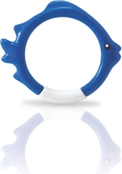 Setul de inele de scufundare Intex în formă de pești este un ajutor ideal pentru învățarea prin joacă a scufundării. Datorită culorilor intense și poziționării stabile pe fundul piscinei, copiii găsesc ușor ținta și exersează cu plăcere ținerea respirației și orientarea sub apă.