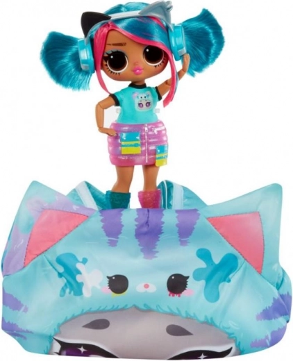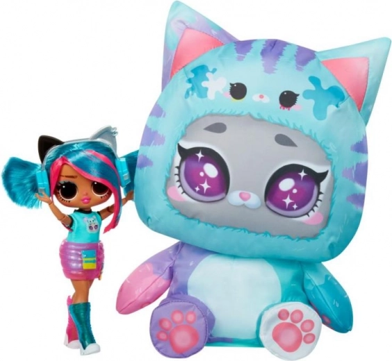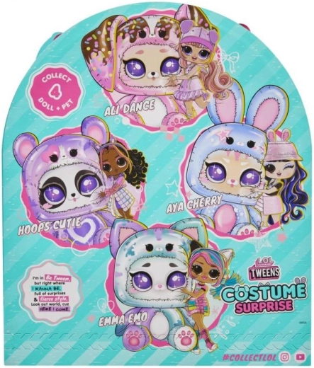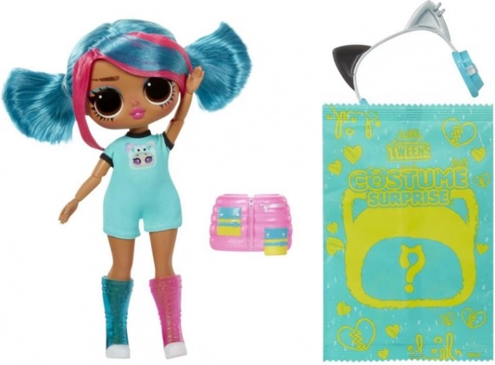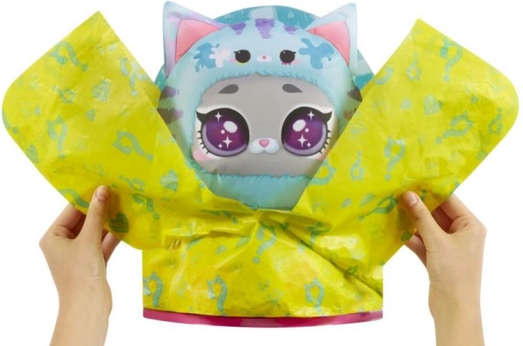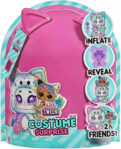 Pregătiți-vă pentru cea mai mare surpriză la despachetat cu L.O.L. Surprise Tweens Costume. Mai întâi deschideți fermoarul de la baza ambalajului și îndepărtați folia roz pentru a dezvălui hârtia de ambalaj misterioasă! Urmăriți cum hârtia se mărește și după ce este complet umflată, rupeți hârtia pentru a dezvălui un costum drăguț de pisicuță turcoaz! Dar surprizele nu se opresc aici! Răsturnați capul de pisică din pluș și găsiți uimitoarea păpușă Emo Emma Tweens în interior!