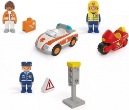 - Doctoriță cu trusă medicală, polițist cu paletă, pompier pe motocicletă, mașină de salvare cu cârlig de tractare, semafor, indicatoare rutiere