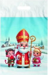 Pungă decorativă din plastic, imprimată cu Moș Nicolae, un înger și un diavol, ideală pentru ambalarea pachetelor de Moș Nicolae. Dimensiunea 29×46 cm oferă suficient spațiu pentru dulciuri, jucării și cadouri mai mari și încântă prin motivul său vesel și expresiv.