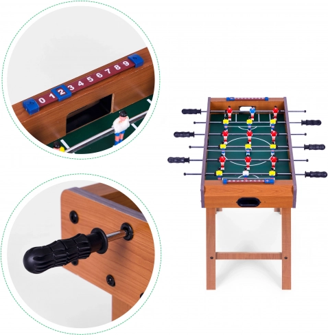 Fotbalul de masă este construit cu atenție la detalii – are un contor de goluri simplu și mânere de cauciuc care oferă un control mai bun asupra jucătorilor și asigură un joc dinamic.