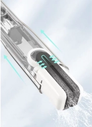 Accesoriile pot fi ușor clătite, este suficient să le clătiți de câteva ori și să stoarceți apa cu un singur deget. Mopul este de asemenea echipat cu un mâner ergonomic care facilitează curățenia și nu îngreunează mâna.
