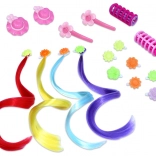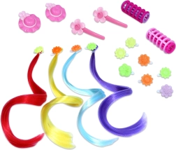 - Set complet de accesorii – pieptene, „ondulator”, agrafe și șuvițe colorate.