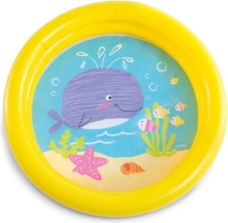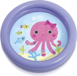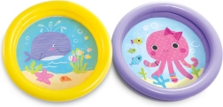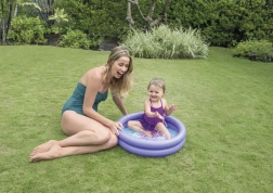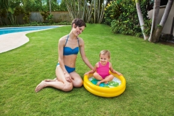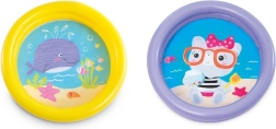 Piscină pentru copii ușoară și compactă, cu diametrul de 61 cm și înălțimea de 15 cm, ideală pentru balcon, terasă și grădină. Are două camere gonflabile, este din vinil rezistent și, datorită designului vesel, îi va încânta pe copiii de la 1 la 3 ani. Ușor de montat și strâns, volum aprox. 17 l la nivelul apei de 8 cm, include set de reparare.